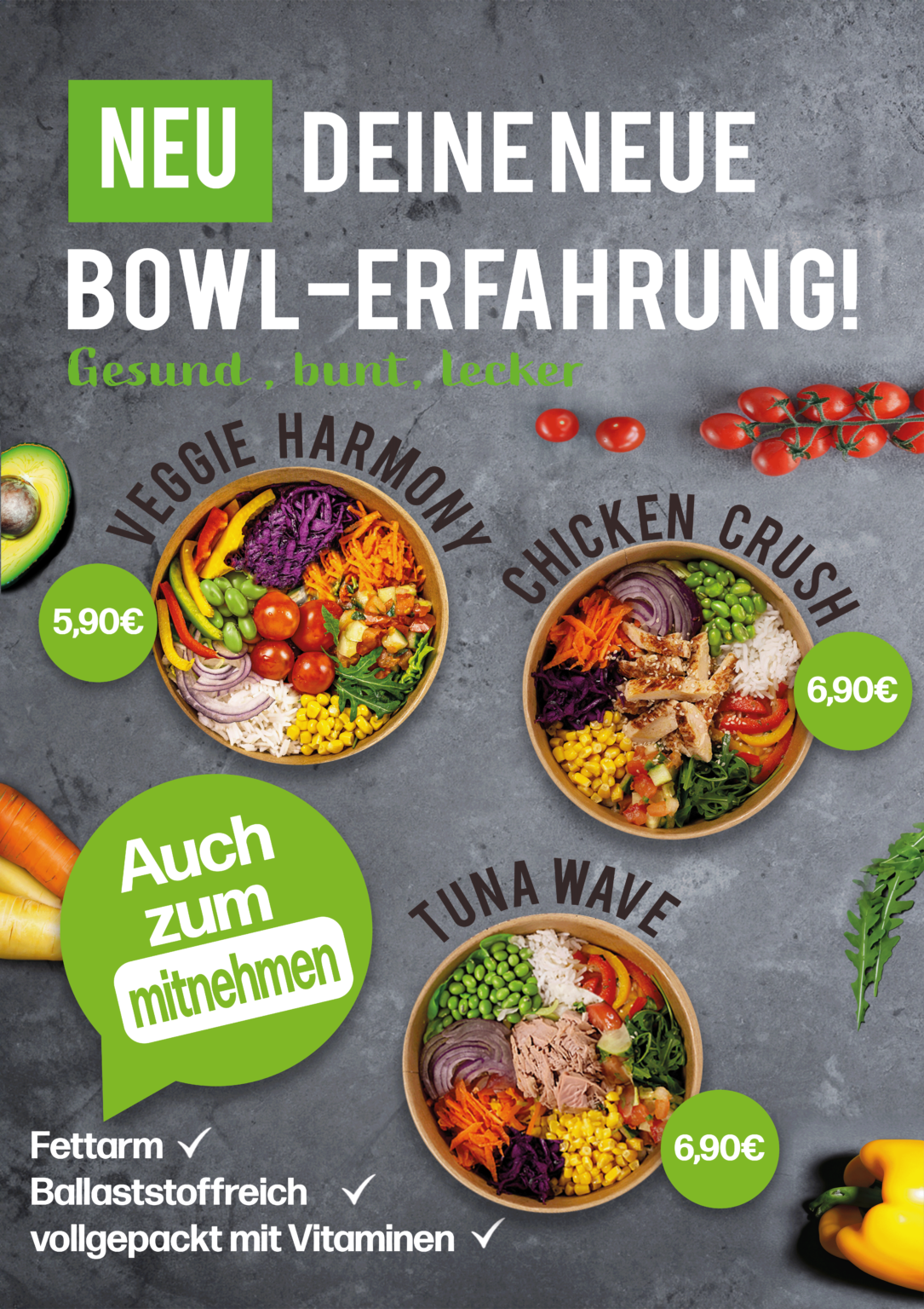 Egal, ob Sie eine Bowl mit saisonalem Gemüse, proteinreichen Zutaten wie z.B. Hähnchen oder Thunfisch wählen, jede Kombination wird sorgfältig zusammengestellt, um Ihnen ein harmonisches Geschmackserlebnis zu bieten.